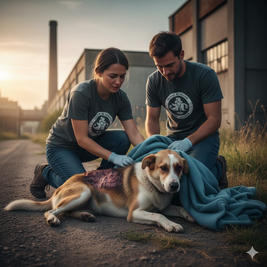 His injuries looked severe — possibly the result of burns from a chemical spill, fire, or extreme neglect. The volunteers quickly wrapped him in a soft blanket and rushed him to the nearest veterinary hospital. No one knew if he would survive the trip.