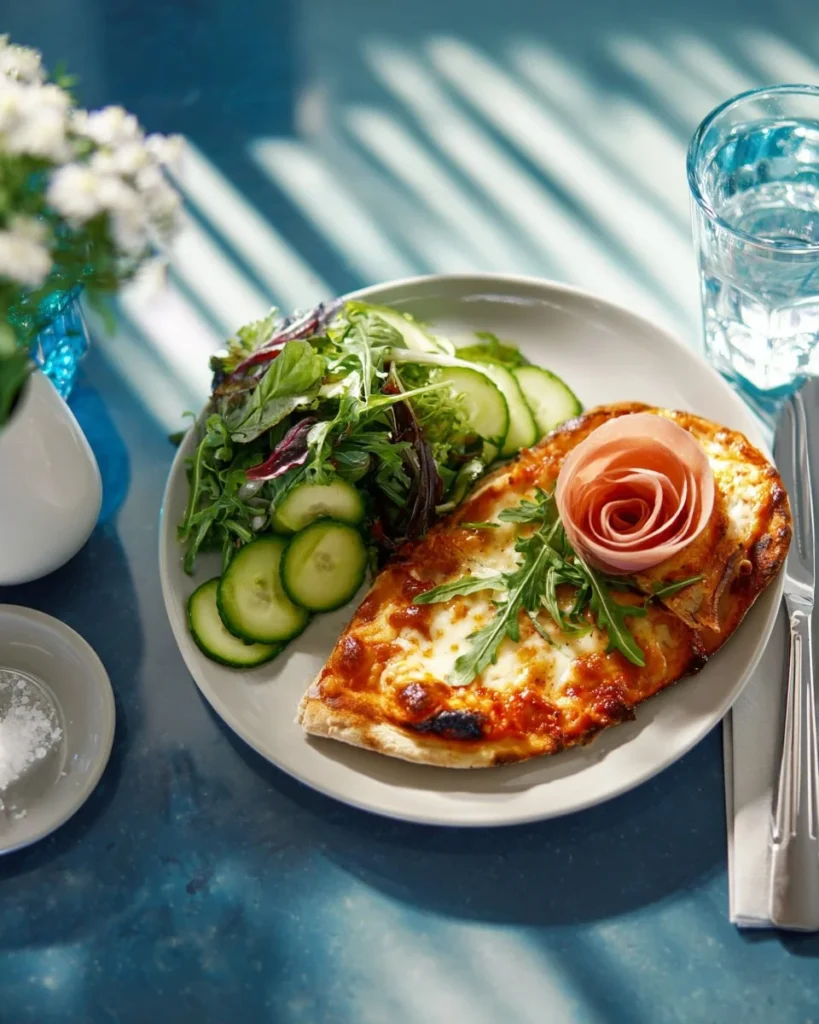 This section shows a clear plan to make the naan pizza. Follow each step and you will get a crisp base, melted cheese, and a pretty coppa rose on top. This recipe is a good choice when you want a high protein meal that still feels light. For a lower calorie choice, use light mozzarella or whole wheat naan. For another warm, veggie-forward dinner that is quick to make, see our couscous with seven vegetables and meat recipe.
