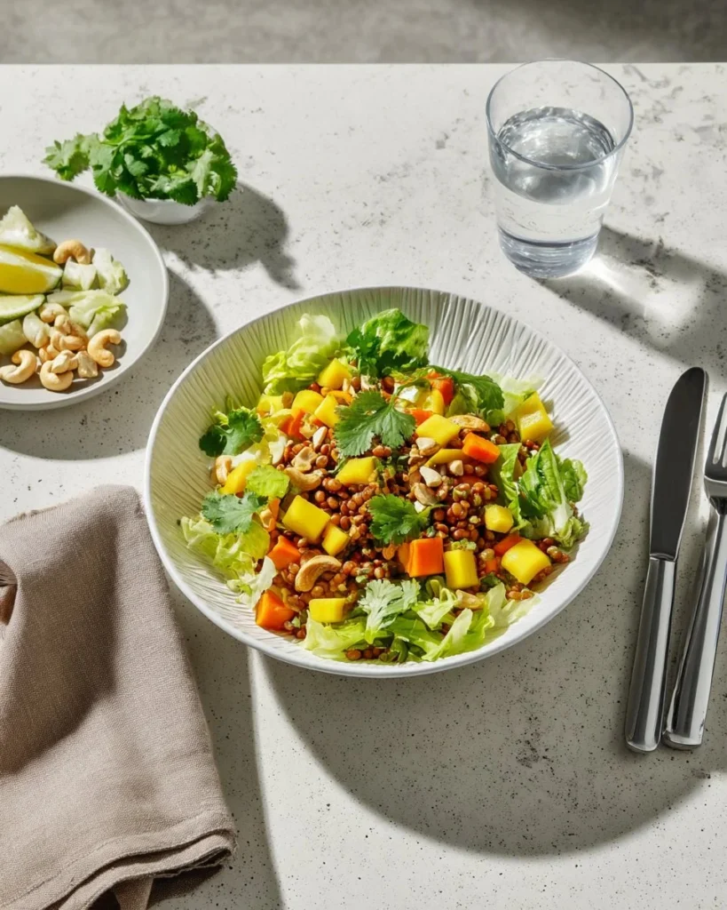 Servez la salade fraîche. Pour une portion équilibrée, comptez environ 1/2 paquet de lentilles par personne, une poignée de salade et 1/4 de mangue. Cette salade est une option faible en calories si vous maîtrisez la vinaigrette : utilisez la moitié d’huile ou remplacez par un peu de vinaigre pour réduire les calories. Elle est parfaite comme high protein meal végétarien quand vous voulez limiter la viande. Pour accompagner, choisissez un pain complet si vous voulez plus de glucides, ou une petite portion de quinoa pour un plat encore plus protéiné.