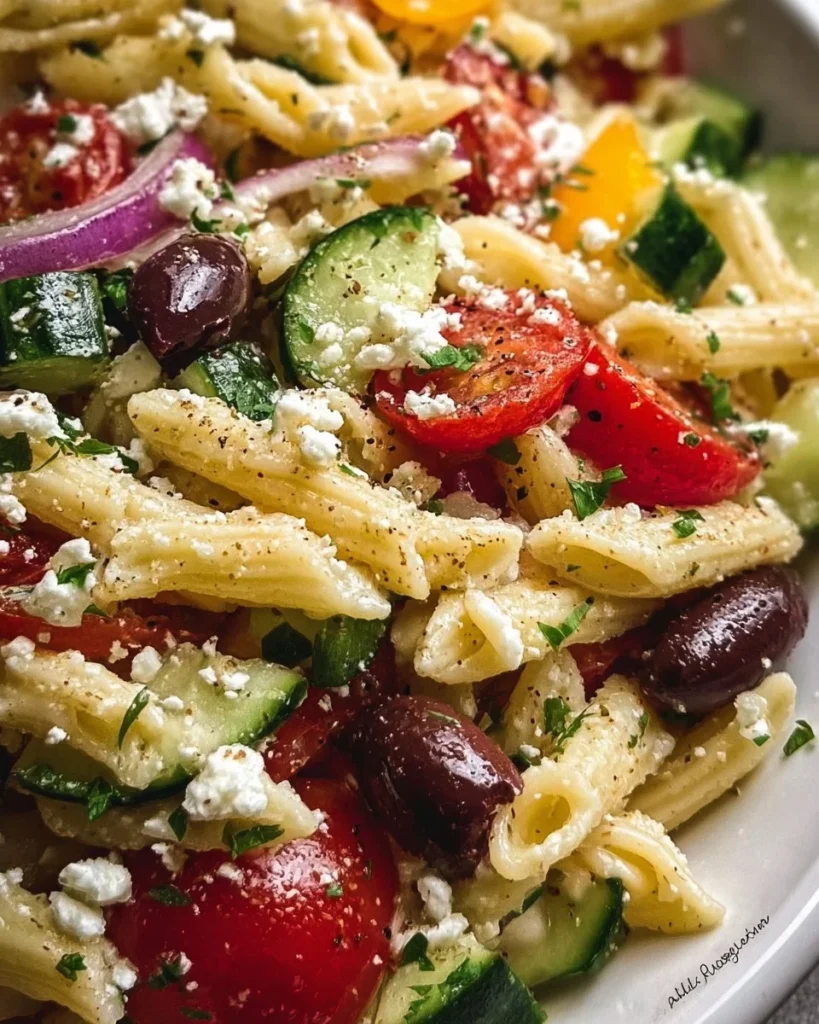 Une salade rafraîchissante et nourrissante combinant pâtes, légumes frais et fromage feta, parfaite pour un déjeuner léger ou un dîner.