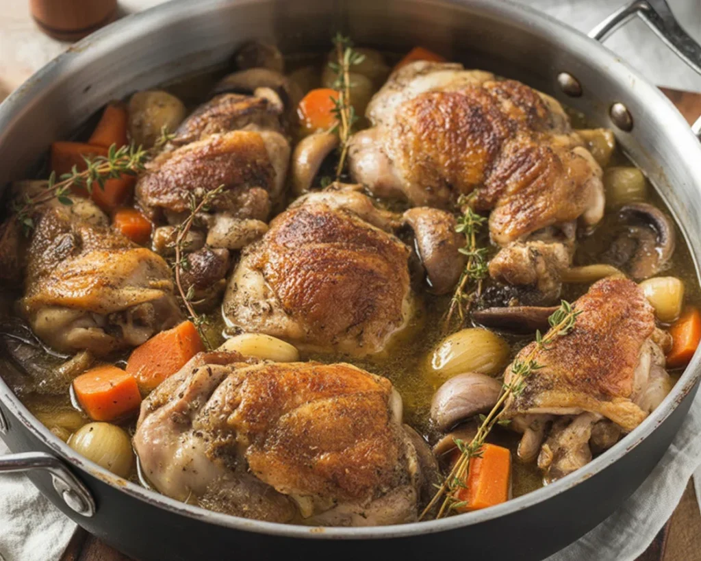 Pas de coq à l’horizon. Pas grave, un poulet de qualité fait le job. Vous pouvez même tester avec des hauts de cuisse de dinde, la texture reste moelleuse si vous cuisez doucement. Et si vous aimez les plats mijotés traditionnels, vous allez aussi adorer ce boeuf bourguignon qui réchauffe le coeur, c’est la même philosophie de cuisson lente et de sauce riche.